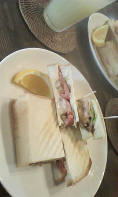 お昼に食べた照り焼きチキンサンドとりんごジュース。